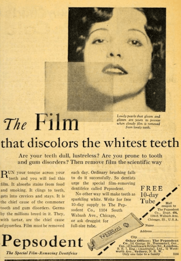 In his ads, he highlighted this “film” as the root of all dental problems, even though it was just the natural coating of the mouth’s saliva and food residues.